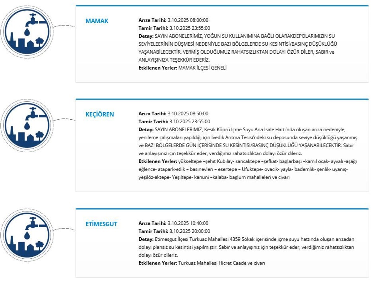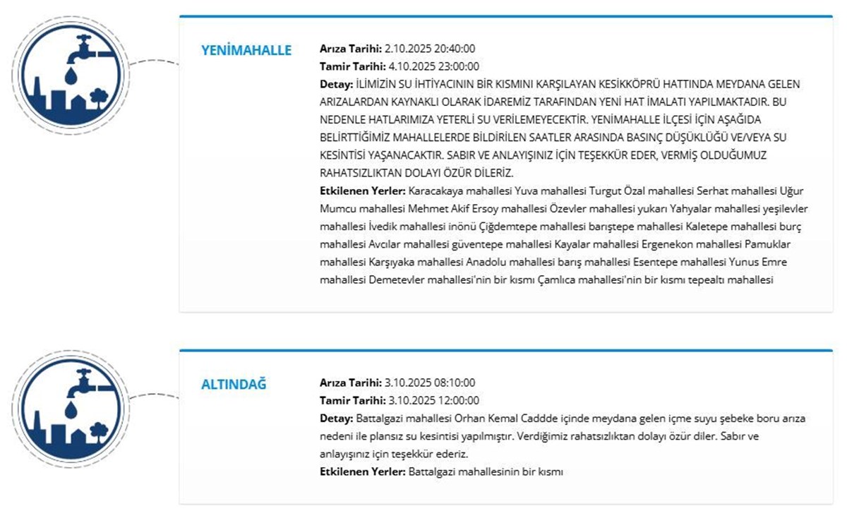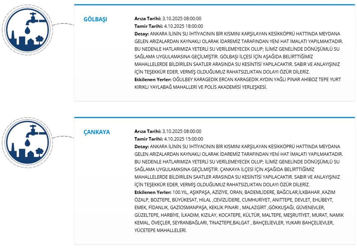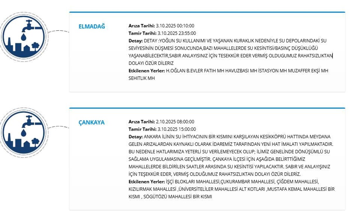 Ankara Su ve Kanalizasyon İdaresi (ASKİ) tarafından yapılan açıklamaya göre, kentte bugün bazı ilçelerde su kesintisi yaşanıyor. Kesintiden Elmadağ, Çankaya, Gölbaşı, Yenimahalle, Altındağ, Mamak, Keçiören ve Etimesgut ilçeleri etkilendi.Ankara Su ve Kanalizasyon İdaresi Genel Müdürlüğü (ASKİ) tarafından yapılan açıklamada Elmadağ, Çankaya, Gölbaşı, Yenimahalle, Altındağ, Mamak, Keçiören ve Etimesgut ilçelerinde uzun süreli su kesintisi yaşanacağını duyurdu. Kesintilerin süresi ASKİ'nin resmi internet adresinden duyuruldu.ASKİ, Kesikköprü İçme Suyu Ana İsale Hattı'ndaki arıza nedeniyle Çankaya ve Gölbaşı ilçelerindeki bazı mahallelerde bıgün saat 08.00'den 4 Ekim saat 08.00'e kadar su kesintisinin uygulanacağını bildirdi.ASKİ'den yapılan açıklamada, iki ilçede yarın saat 08.00 ile 4 Ekim 08.00 arasında 24 saatlik zorunlu su kesintisinin olacağı, yüksek kotlardaki abonelerin 4 Ekim saat 18.00'den sonra su almasının öngörüldüğü belirtildi.Su kesintisinden etkilenecek bölgeler şöyle:"Çankaya ilçesindeki Bahçelievler, Bakanlıklar, Balgat, Beştepe, Cebeci, Demirlibahçe, Devlet, Dilekler, Doğuş, Emek, Emniyet, Emrah, Esat, Eti, Fakülteler, Gültepe, İleri, İmrahor, Kavaklıdere, Kızılay, Kızılırmak, Kocatepe, Kurtuluş, Kültür, Maltepe, Mebusevler, Meşrutiyet, Mimar Sinan, Nasuhiakar, Remzioğlu, Seyran, Söğütözü, Şenyuva, Tınaz, Topraklık, Turgut Reis, Türközü, Y. Bahçelievler, Yeşilkent, Yücetepe, Zafertepe, Anıttepe, Mustafa Kemal, Aşağı Öveçler, Ayrancı, Harbiye, Öveçler, Y. Öveçler, S. Meh. Paşa, Ehlibeyt, Cevizlidere, 100. Yıl, Bağcılar, Güven, G. O. P, Aşıkpaşa, Boztepe, Bademlidere mahalleleri ve Malazgirt Mahallesi'nin üst kotları.Gölbaşı ilçesindeki Polis Özel Harekat Yerleşkesi, Yaylabağ, Ahiboz, Oğulbey, Karagedik, Yağlıpınar, Tepeyurt ve Kırıklı mahalleleri."